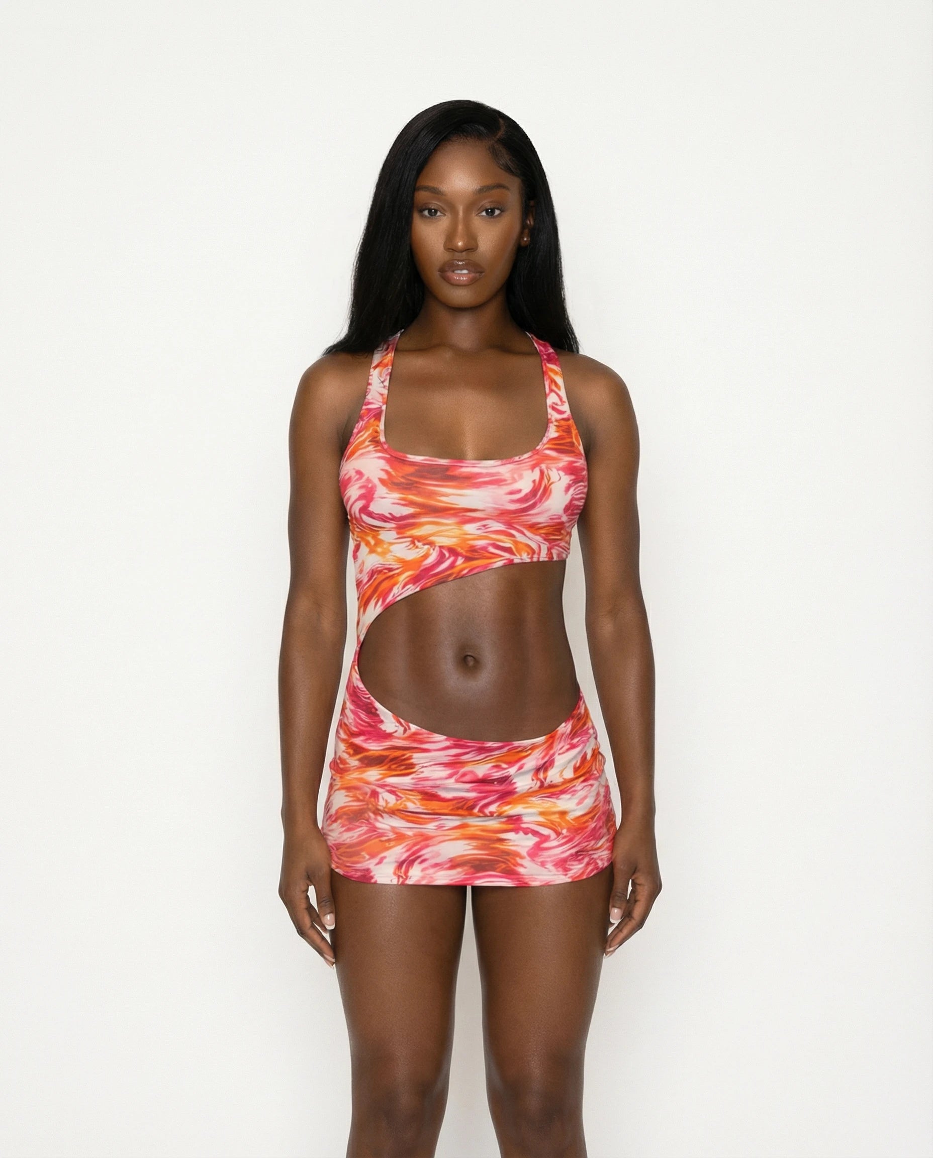 Turn heads in our Tropical Cutout Mini Dress, the ultimate blend of sexy and chic. Featuring a bold asymmetrical cutout and a figure-hugging silhouette, this dress is designed to accentuate your curves while keeping you effortlessly stylish. The halter neckline offers a flattering fit, while the vibrant red, orange, and white tropical print brings the perfect island vibe.